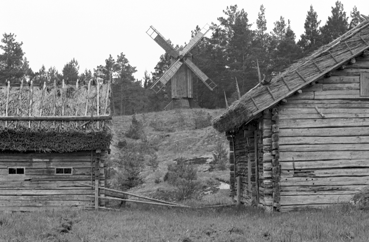 Ålandsresa. Timmrade stugor med vasstak. Väderkvarn
