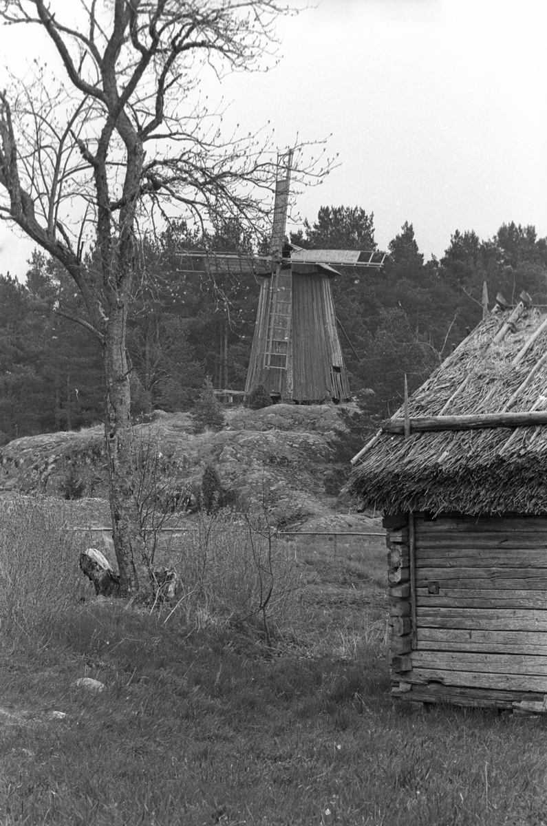 Ålandsresa. Timmrad stuga med vasstak. Väderkvarn
