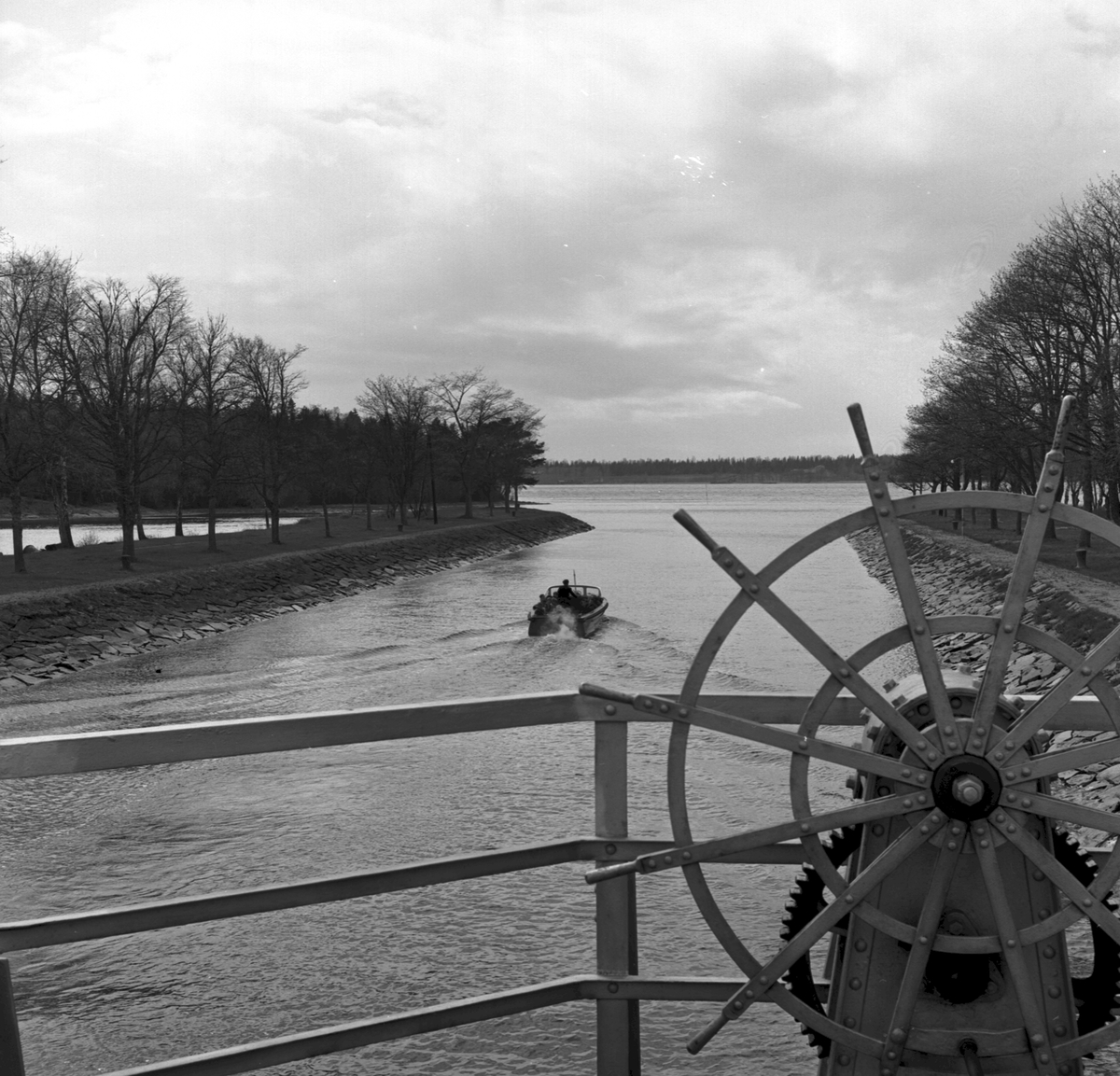Ålandsresa. Ratt för broöppning och stängning. Motorbåt