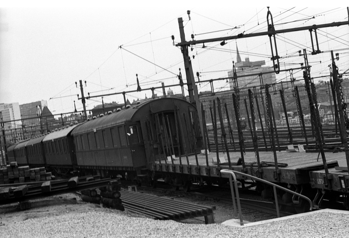 Statens Järnvägar, SJ Biltåg. Kungsgatsbron skymtar mellan godsvagnens stakar till höger i bild. Bilden tagen mot söder.
