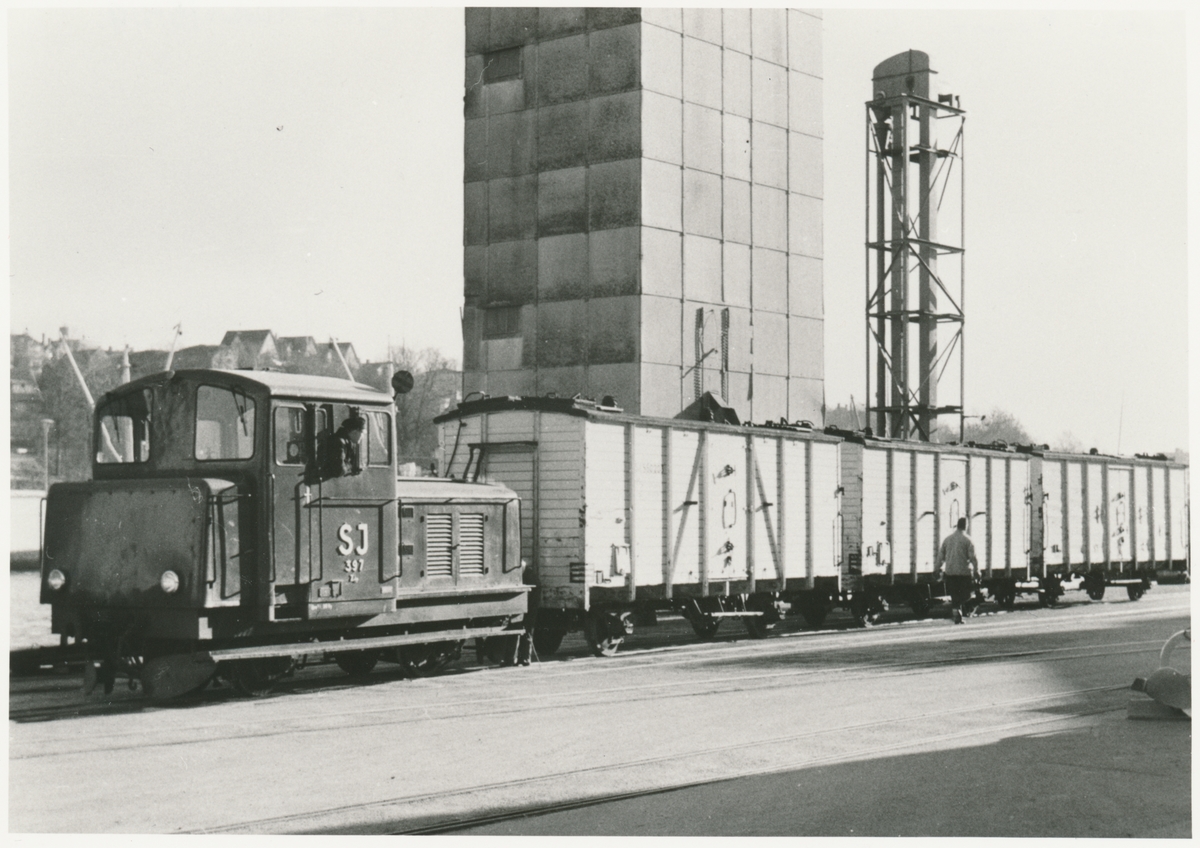 ”Griståg” på Visby hamn. Tåget fraktade djurkroppar från slakteriet till Visby hamn fram till 1963. Lokomotor som syns på fotot är Statens Järnvägar, SJ Z4p 397. Byggdes av Kalmar Verkstad AB 1956. Den hyrdes av Andelsslakteriförening.