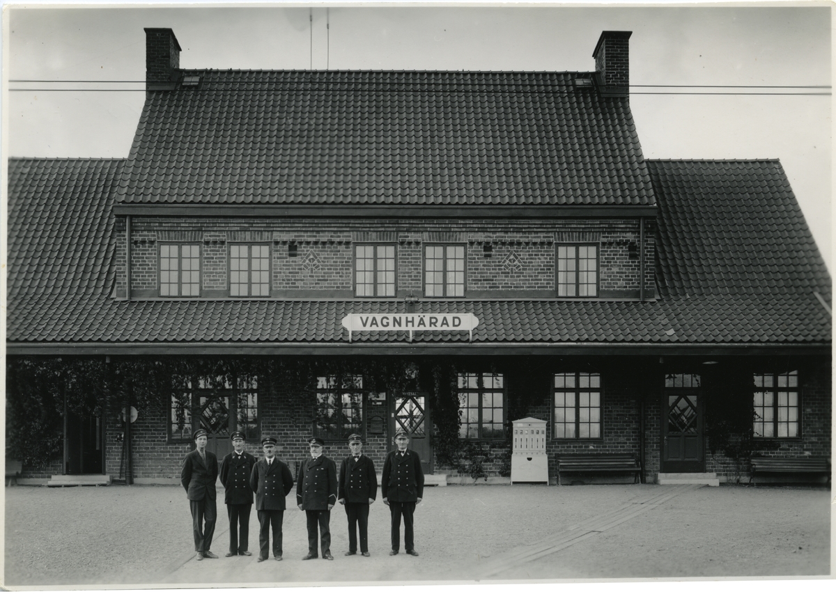 Gruppfoto utanför stationshuset av personalen i Vagnhärad.