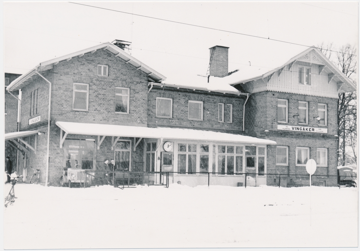 Stationshus från sydväst med modernare fönstren. Stationen anlades 1862. Vingåker station hade stationshus av en lite mer ovanlig modell. Ett imponerande "kråkslott" med många rökhuvar på taket.