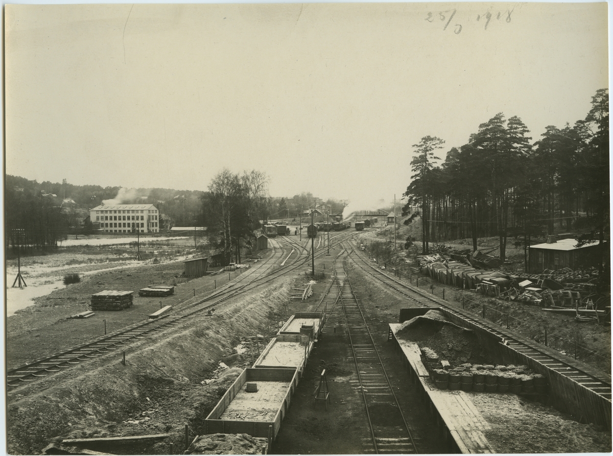Det vänstra spåret kommer från Saltskog. Spåret längs lastbryggan leder till lokstallet och spåret till höger om lastbryggan leder till Södertälje uthamn. Spåret bland träden till höger leder upp till Södertälje Södra som när bilden togs ännu var under anläggning.