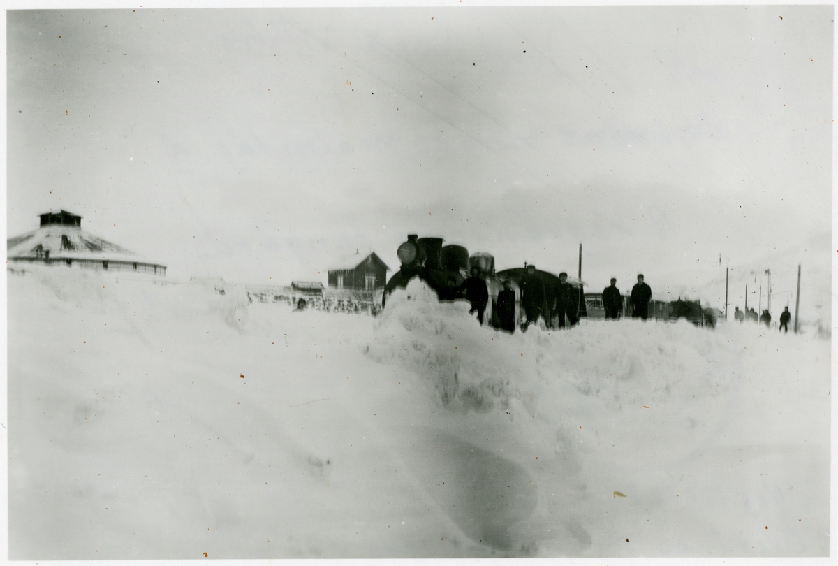 Insnöat Norskt malmtåg på Riksgränsens bangård.