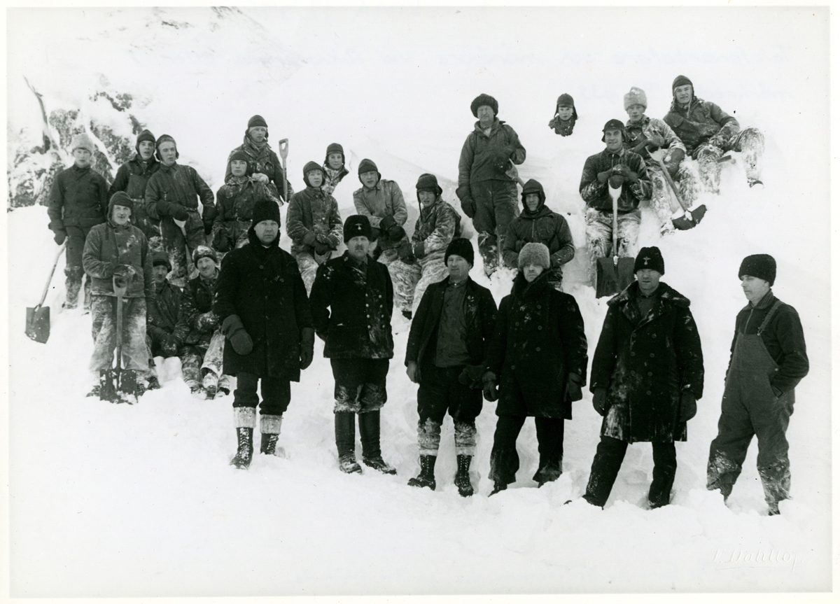 Telefonarbetare och snöröjare vid Riksgränsen efter snöskredet 10/2 1933.