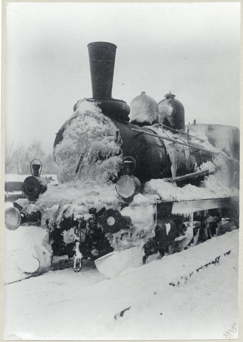 Skövde station med insnöat ånglok troligen SJ Kd 409.