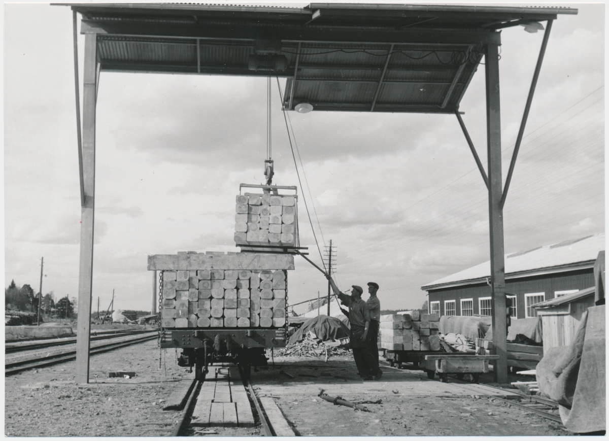 Omlastning med travers vid Rånäs Stockholm - Roslagens Järnvägar (SRJ), maj 1956.