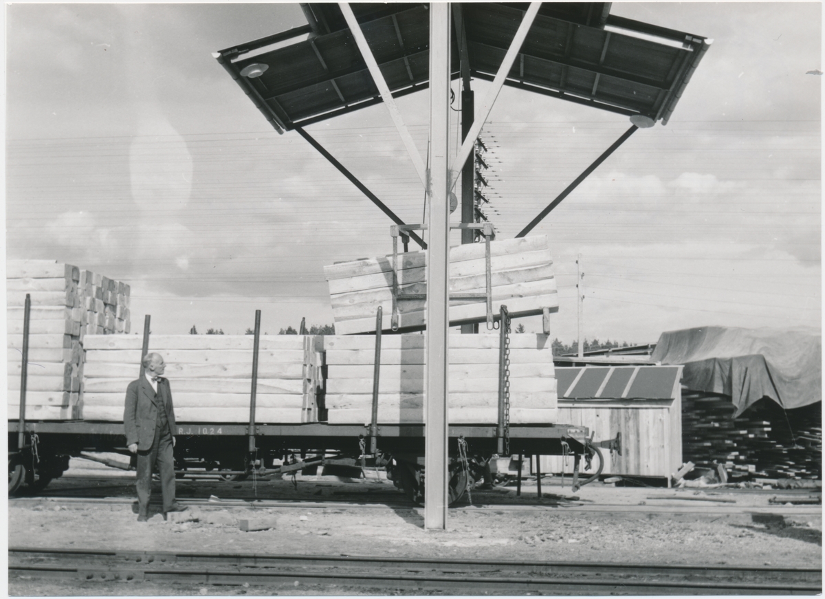 Omlastning med travers vid Rånäs Stockholm - Roslagens Järnvägar, SRJ, maj 1956.