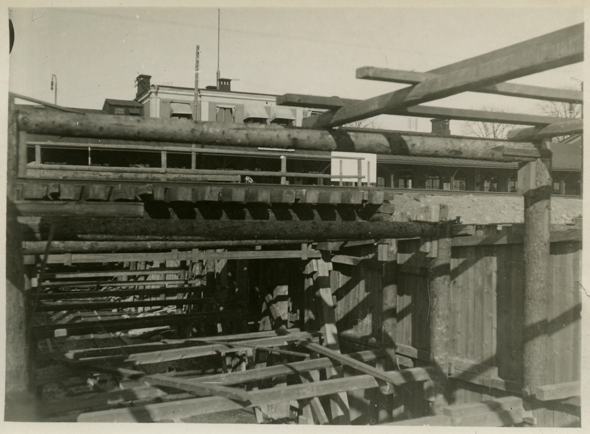 Nässjö. Spånt för tunnelbyggnaden samt provisorisk bro under byggnadstiden.