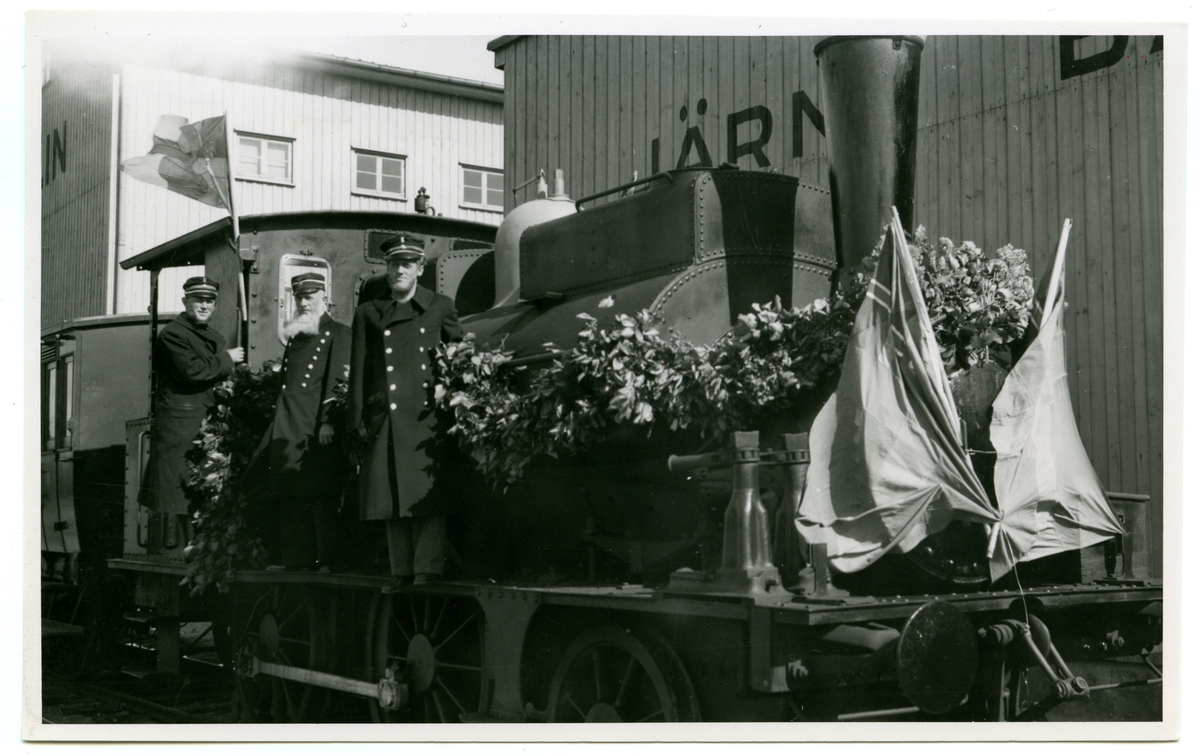 Barnens dag i Kristianstad 1946. Festspel - invigning av banan Hässleholm - Kristianstad år 1865. Loket Carl XV i autentiskt i samma utstyrsel från kungamälet 1865.