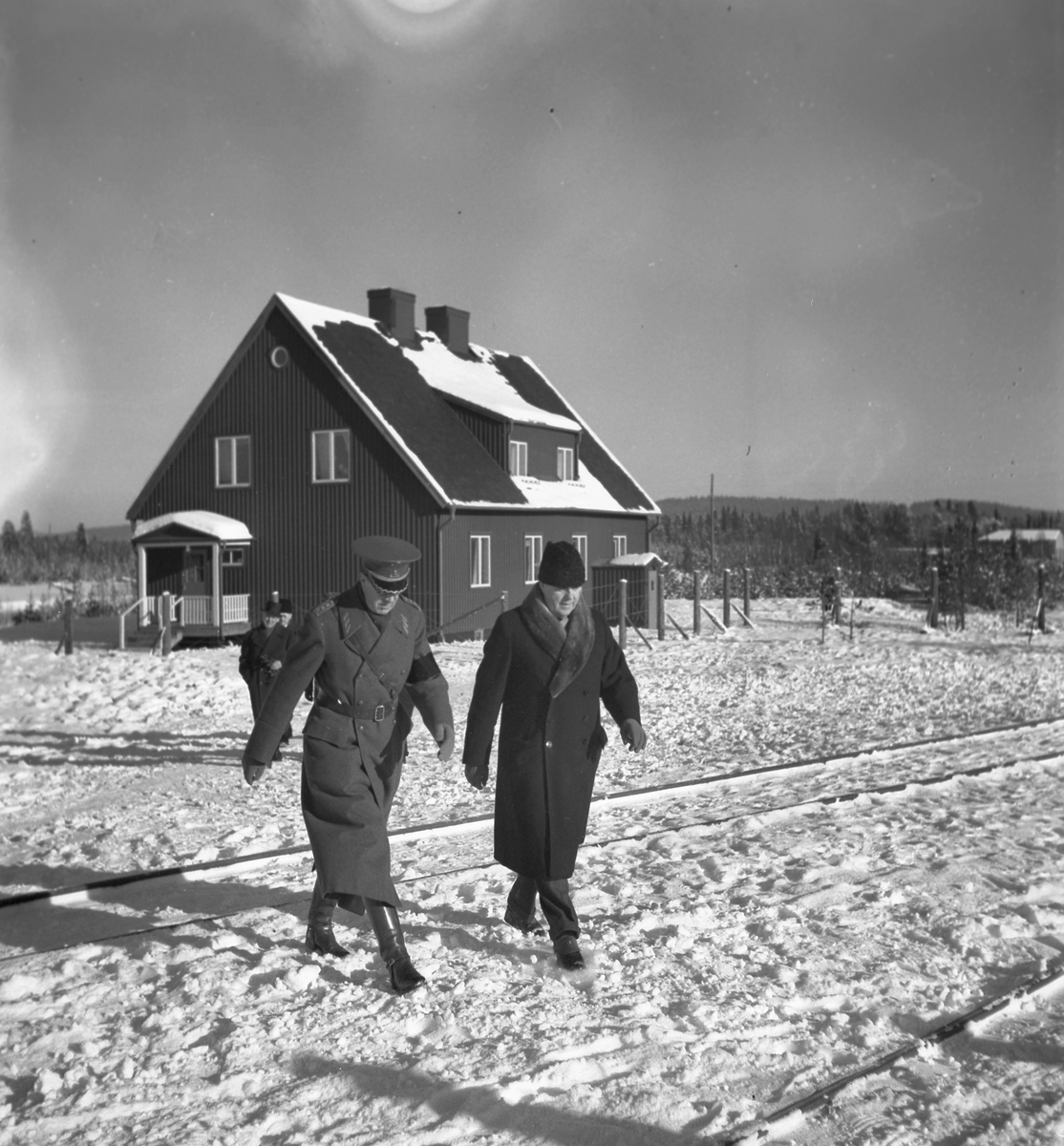 Kronprins Gustaf Adolf och generaldirektör Granholm på inspektion i Älvsbyn i samband med invigningen av eldrift på sträckan Långsele-Boden