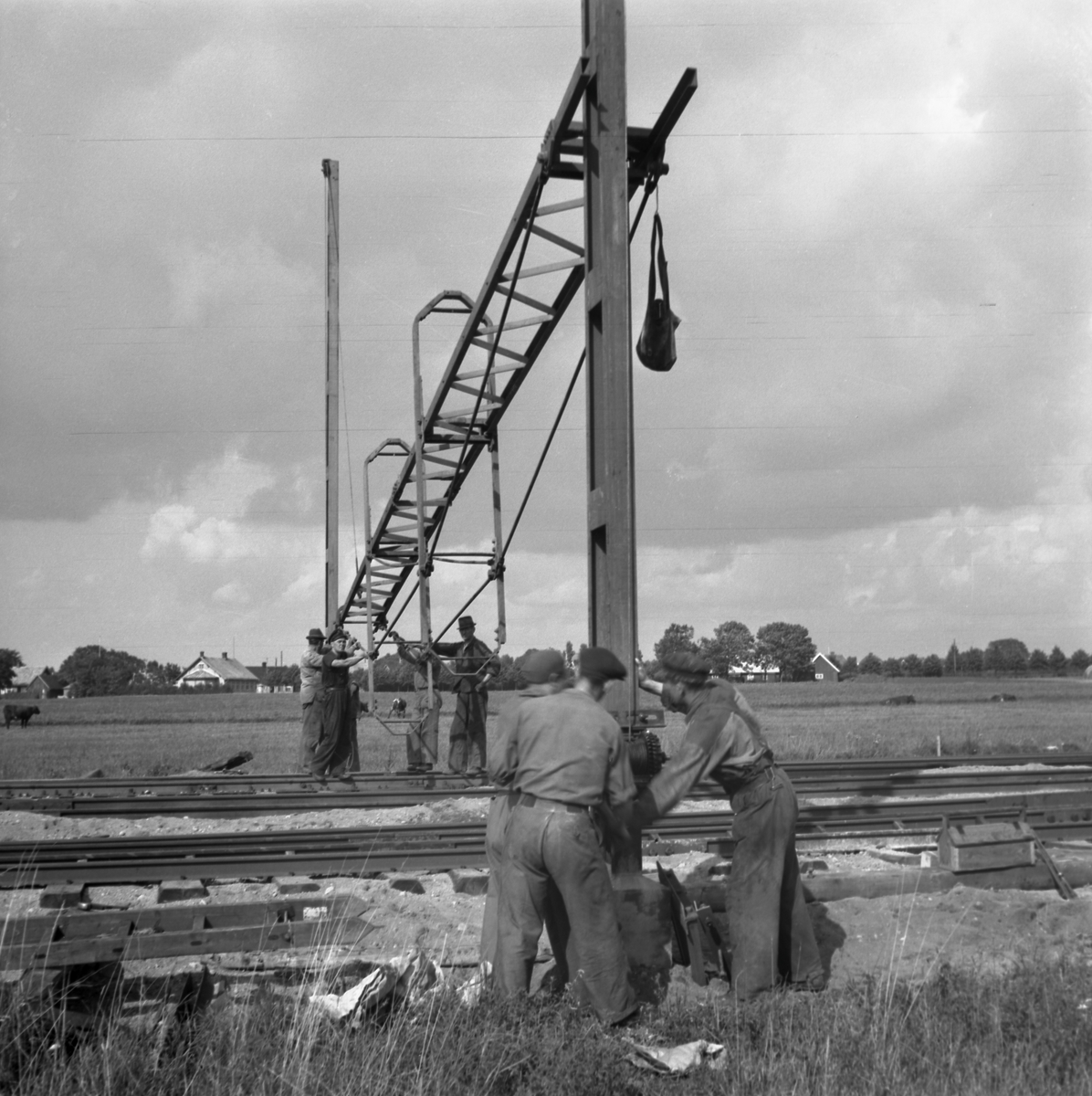 Elektrifieringen av sträckan Helsingborg-Hässleholm. Ledningsbrygga hissas.