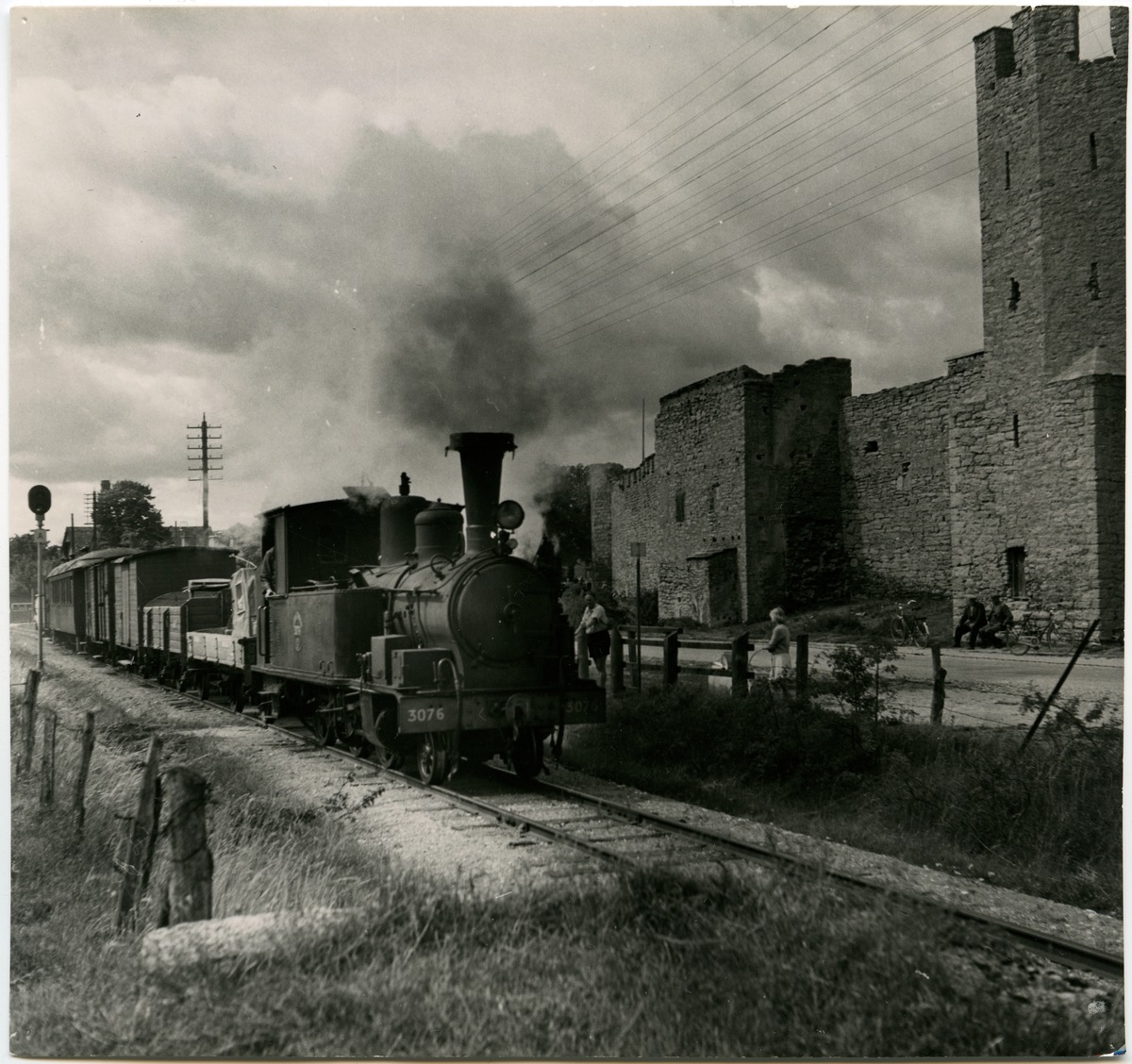 Gotlands Järnvägar (GJ), med Statens Järnvägars (SJ) lok SJ S13p 3076 "Roma", vid Visby ringmur, juli 1950.