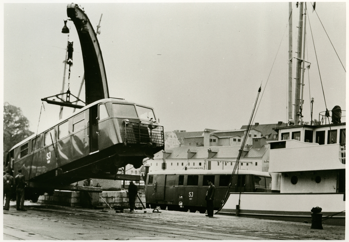 Lastning av rälsbuss (Hilding Carlsson typ) på M/F Solklint i Visby hamn. Statens Järnvägar. SJ UFCo2p 1687 är redan lastad.