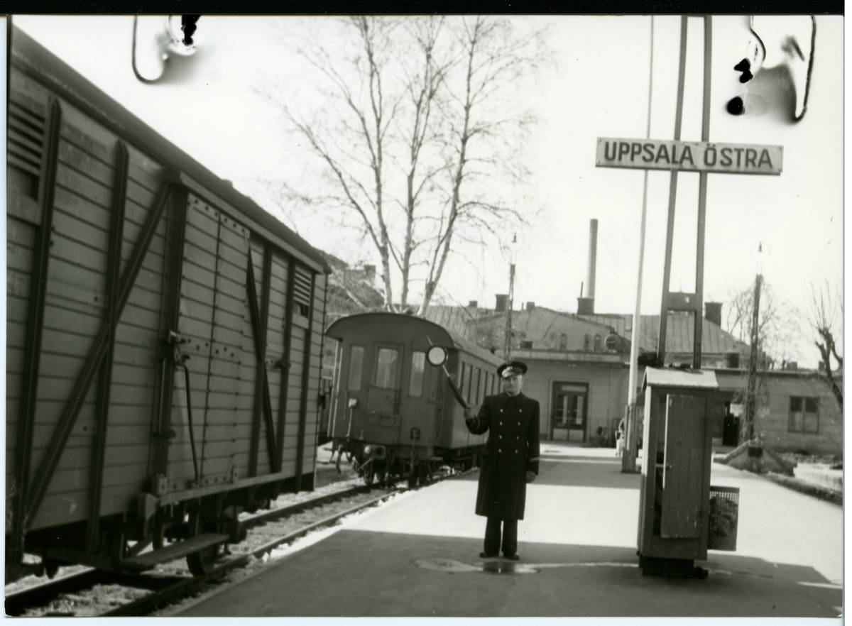 Uppsala Östra SRJ Stockholm-Roslagens-Järnvägar, 1956-05. Stins Sten Rydberg, började sin tjänstgöring i Uppsala 1951.