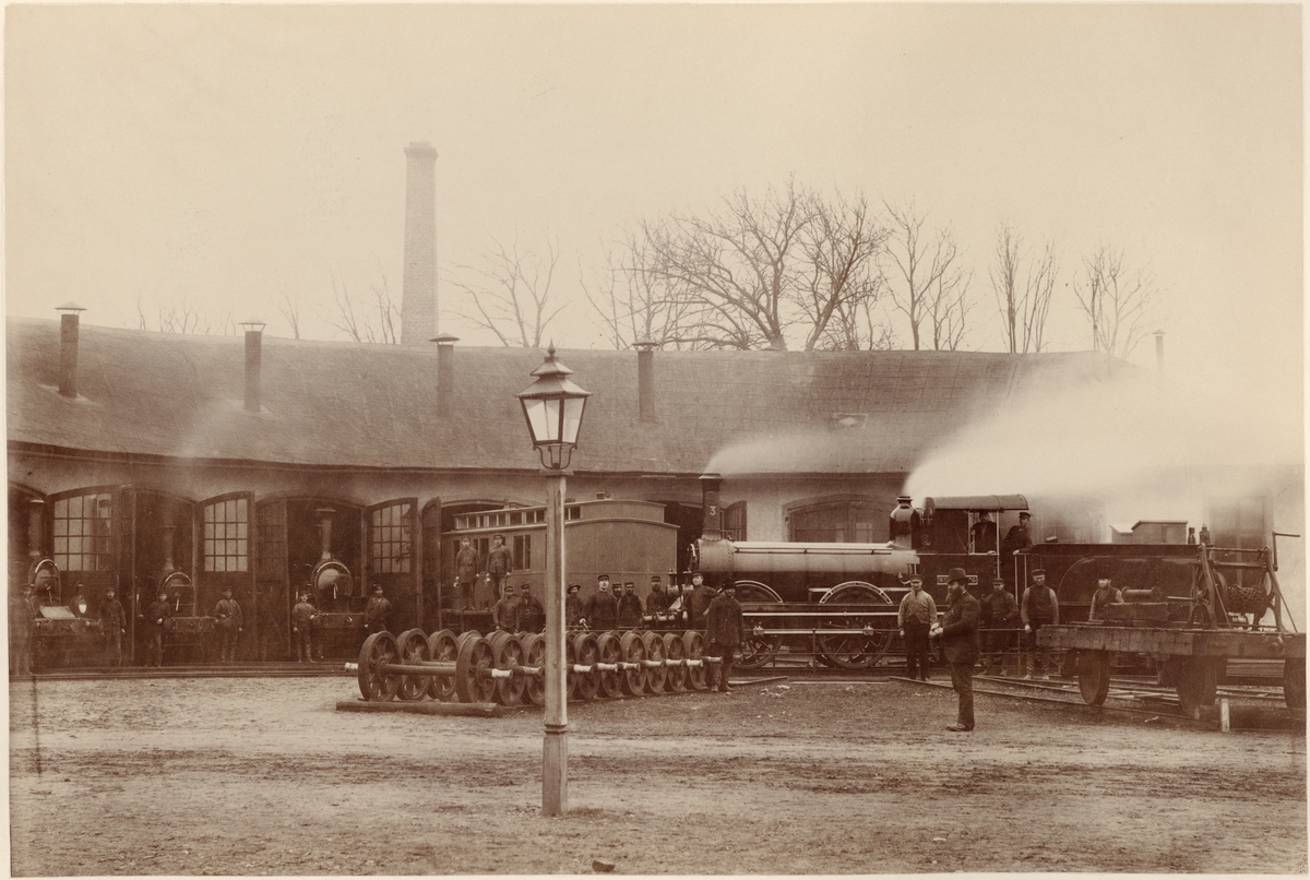 Vänersborg. Lokstall och verkstad. Före breddning av järnvägen. Uddevalla Vänersborg Herrljunga Järnväg, UWHJ lok 1 "Trollhättan", UWHJ lok 2 "Uddevalla", UWHJ lok 3 "Wenersborg" och UWHJ lok 4 "Grefve E Sparre".