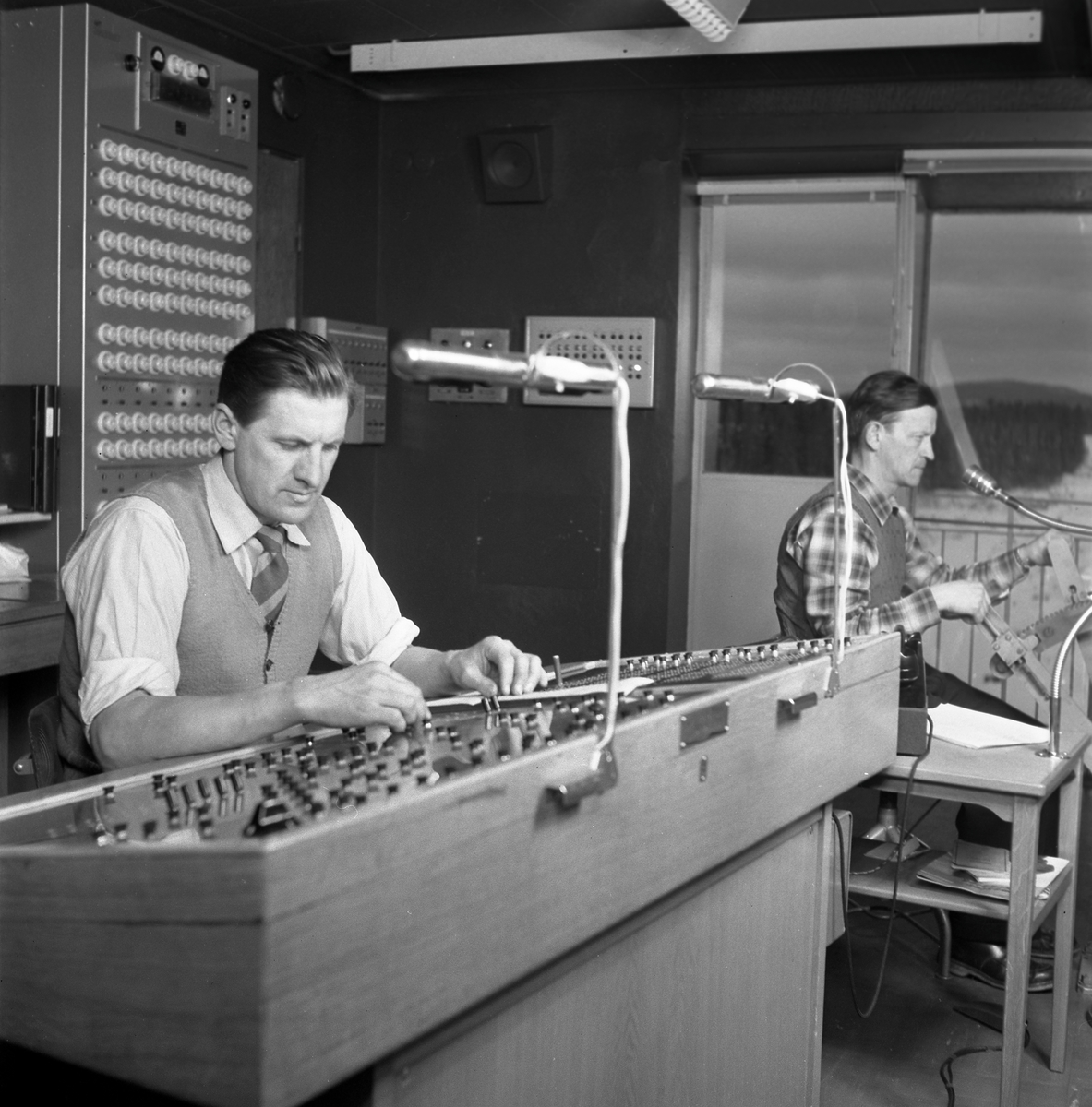 Titel: Mekanisering av bangården. Rangerledare och bromsare vid manöverbord. Troligen Ånge