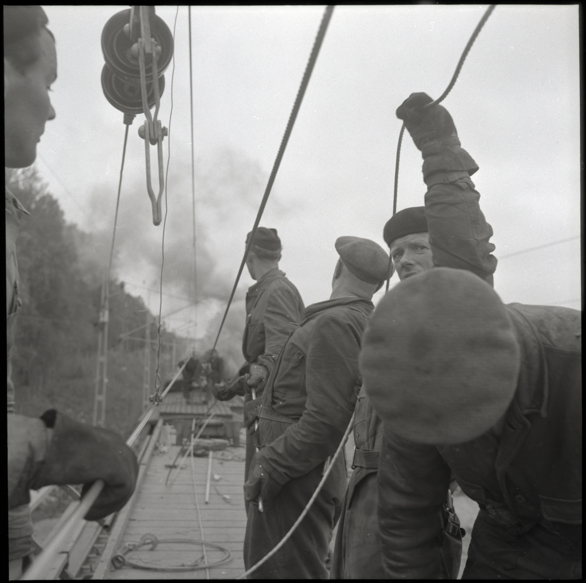 Titel: Montering av kontaktledning sker från ett särskilt monteringståg, uppbyggt av äldre godsvagnar.