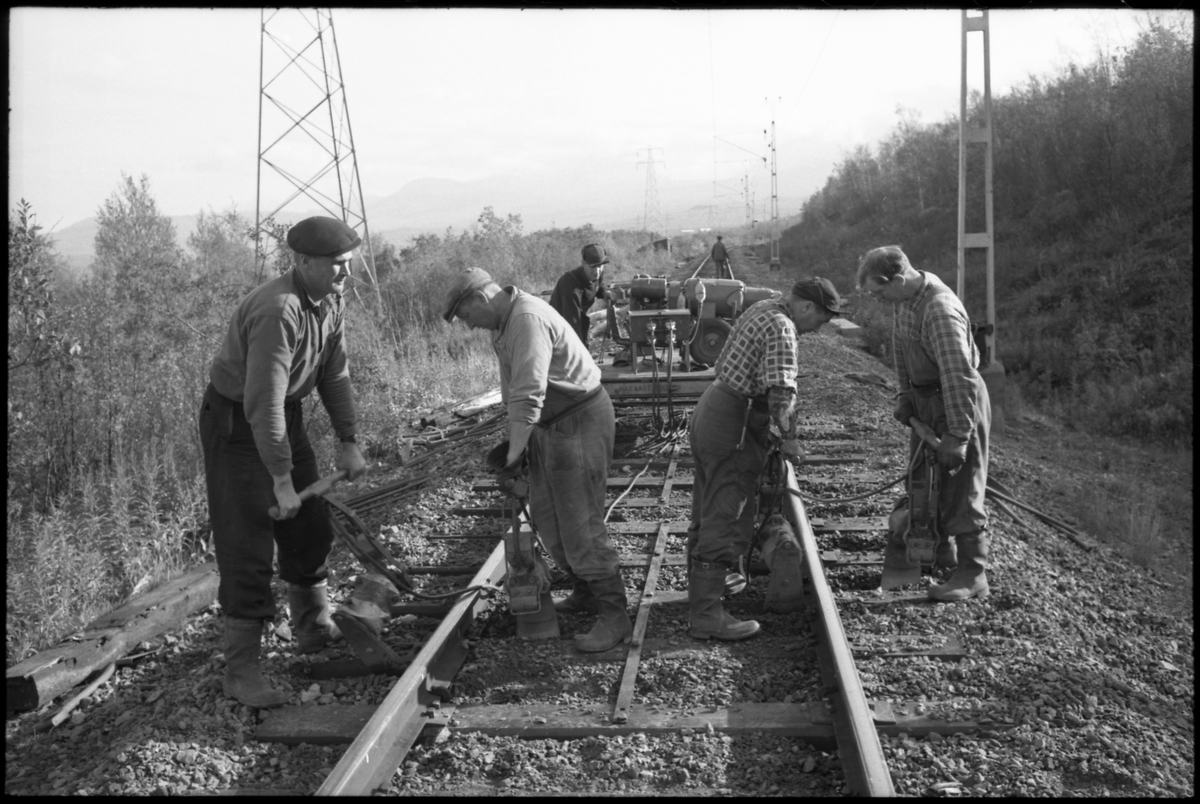 Upprustning av malmbanan Kiruna-Riksgränsen. Markberedningsarbete på sträckan Abisko- Björkliden. Ballasten stoppas med hjälp av en stoppningsmaskin av märket Jackson, av personalen kallad "vibro" eftersom den vibrerade kraftigt.