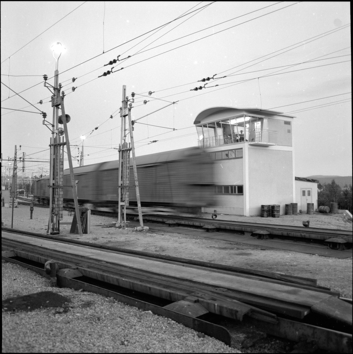 Rangertorn på rangerbangården på Ånge station. Godsvagnar i rullning. Bromsbalkar.