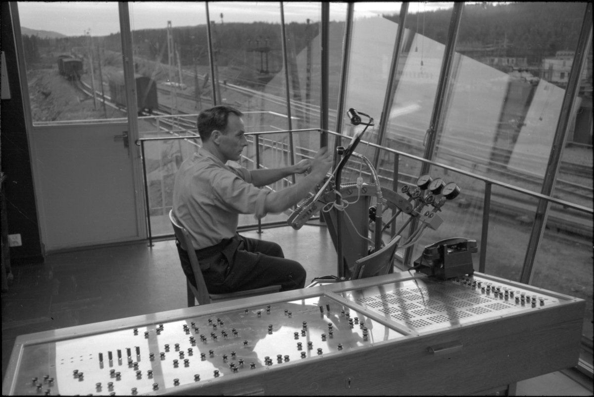 Rangertornet på rangerbangården på Ånge station. Ett elektriskt ställverk och personal vid en automatisk växelomläggningsmaskin.