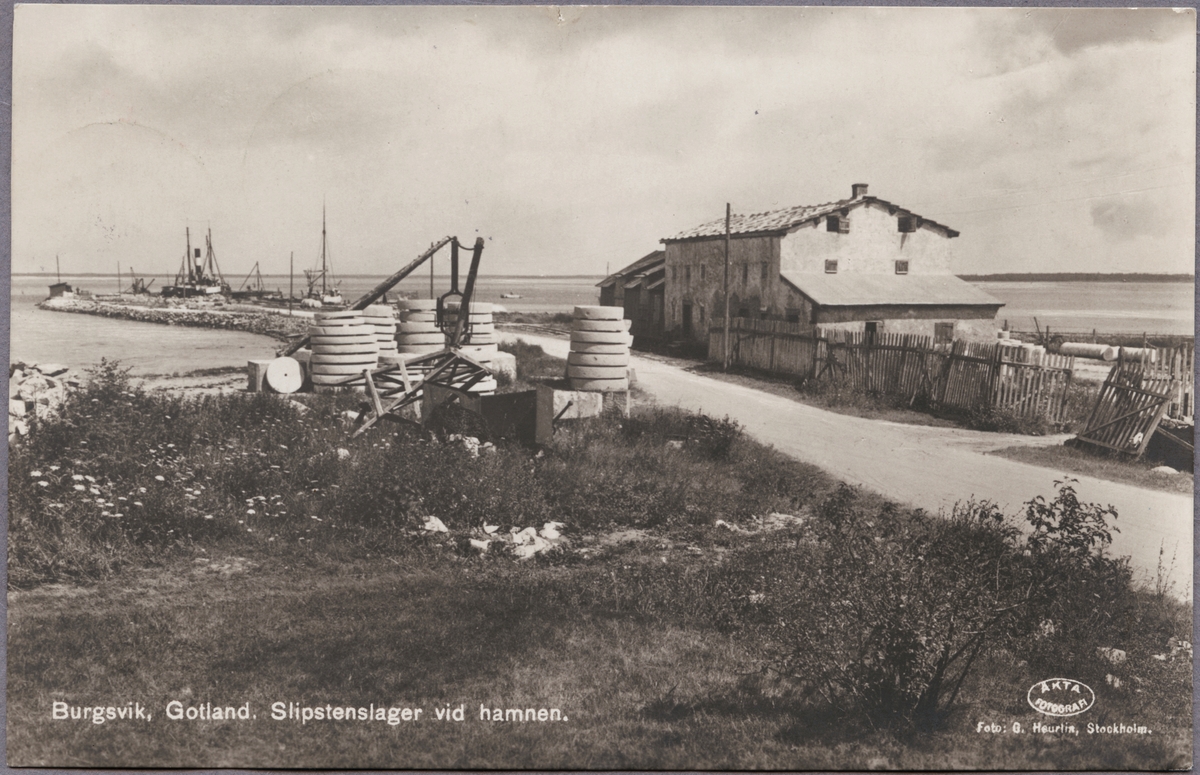 Vy över hamnen i Burgsvik, Gotland. Slipstenslager i förgrunden.