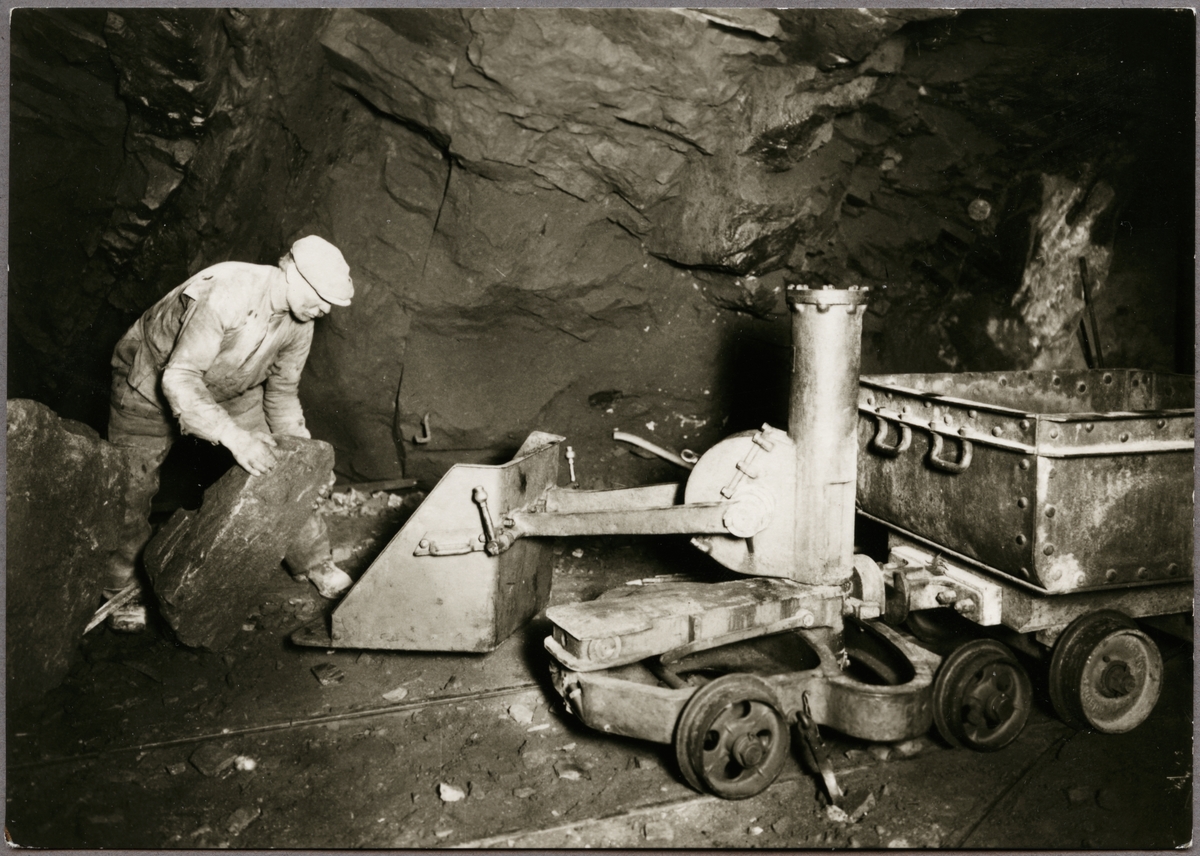 Titel: Gruvarbetare lastar ett stenblock på en tryckluftdriven lastmaskin.