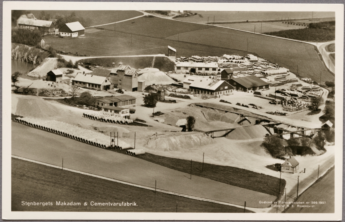 Flygfoto över Stenbergets makadam och cementfabrik.