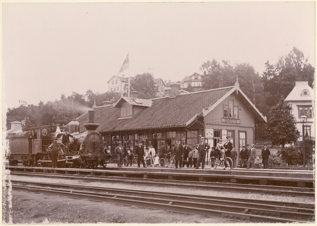 Frånvänster: lokputsare Gelin (framför loket) kolkarl Axelsson ( på loket), Sts E.Eriksson (t.v. om Nyhlén) Stk. Nylén ( vituniform), Stk Mandell ( med cykel) Stins Arfvisson ( med signalflaggan i hand), Ex. skrivb.IJT Neander (i studentmössa), Sts. Söderberg(1938 Fti)-bakom pojken på cykeln-Stk Widing (bakom soffan).
