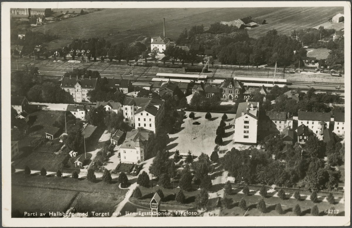 Flygfoto över torget och järnvägsstationen i Hallsberg.