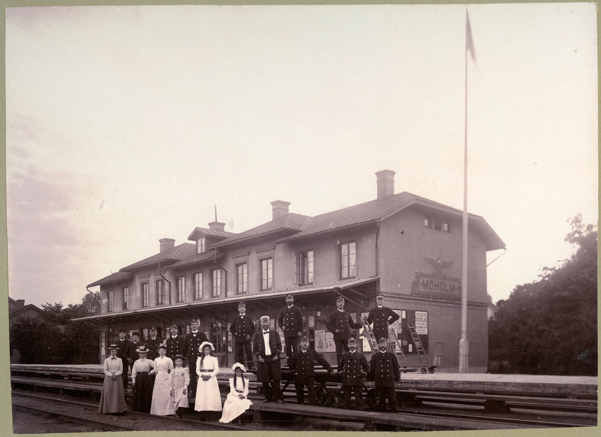 Titel: Det första stationshuset byggt som Partilleds första stationshus. Huset rivet 1873. Andra stationshuset ,1873, ett större tvåvånings stenhus. Tillbyggdes 1891 i och med MKJs anslutning. Före tillbyggnaden utgjorde det modell för Stehag och Karlskoga stationshus. MKJ, Mariestad - Kinnekulle Järnväg