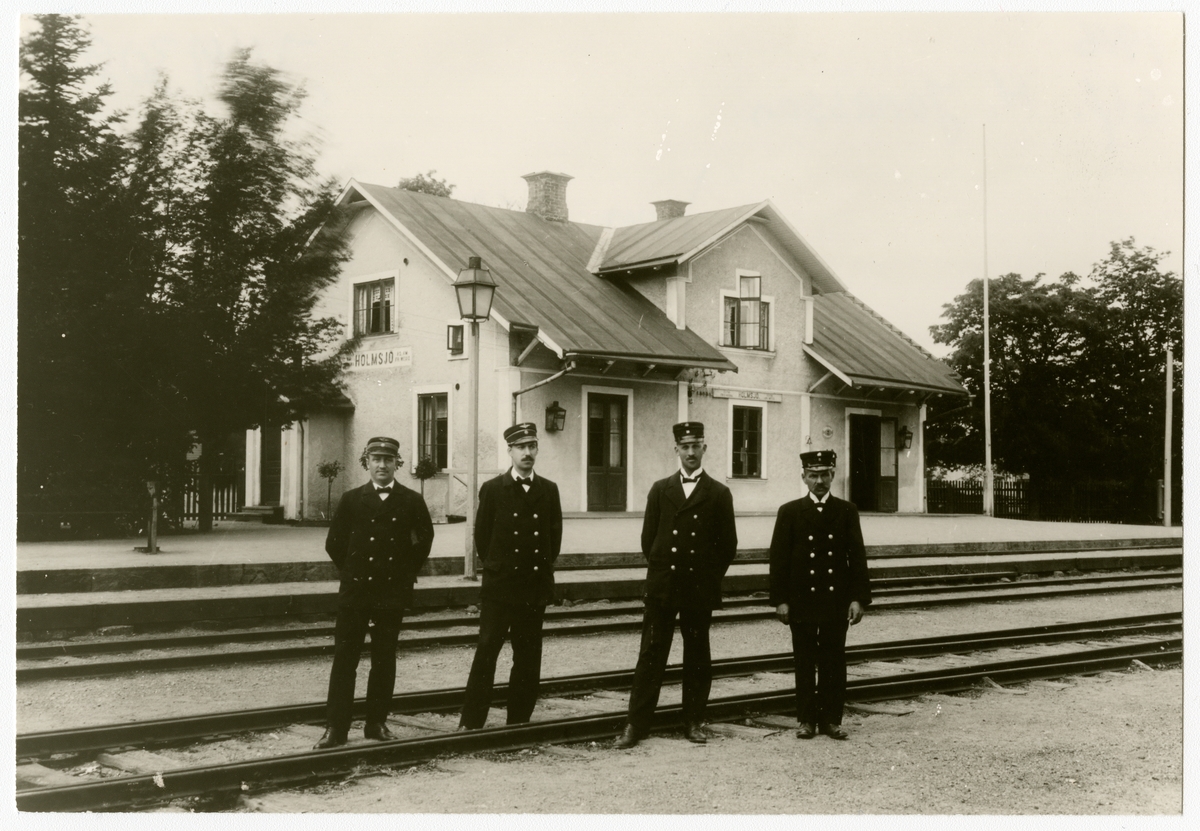 Holmsjö station. En av männen är stationsföreståndare Henning Jonasson.