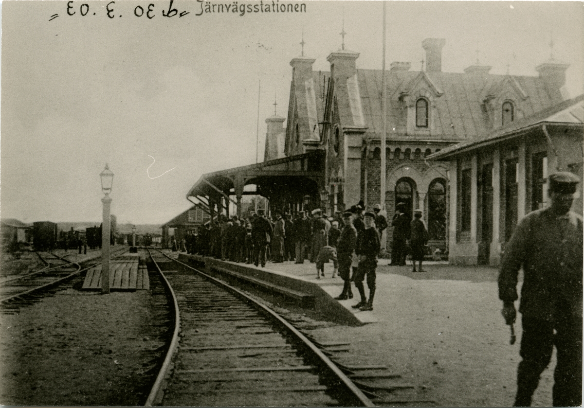 Ankommande tåg från Ljusdal. Envånings stationshus i sten, rappat och putsat. Stationen ombyggd 1924. Godsmagasinet rivet 1995.