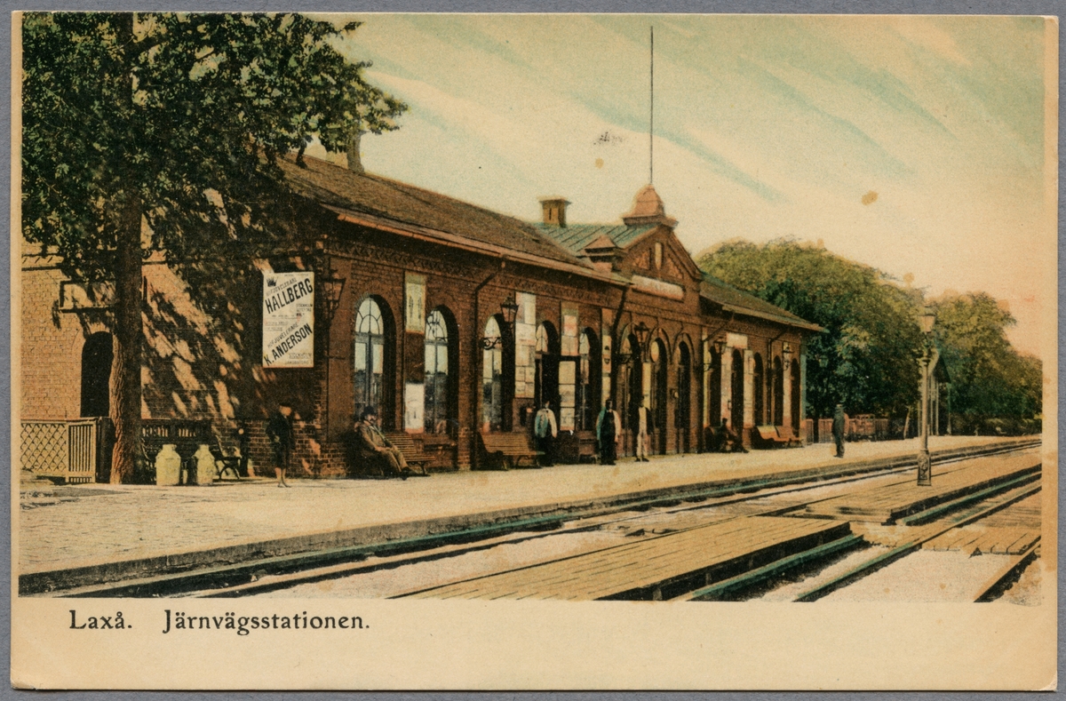 Handkolorerat vykort av järnvägsstationen i Laxå.