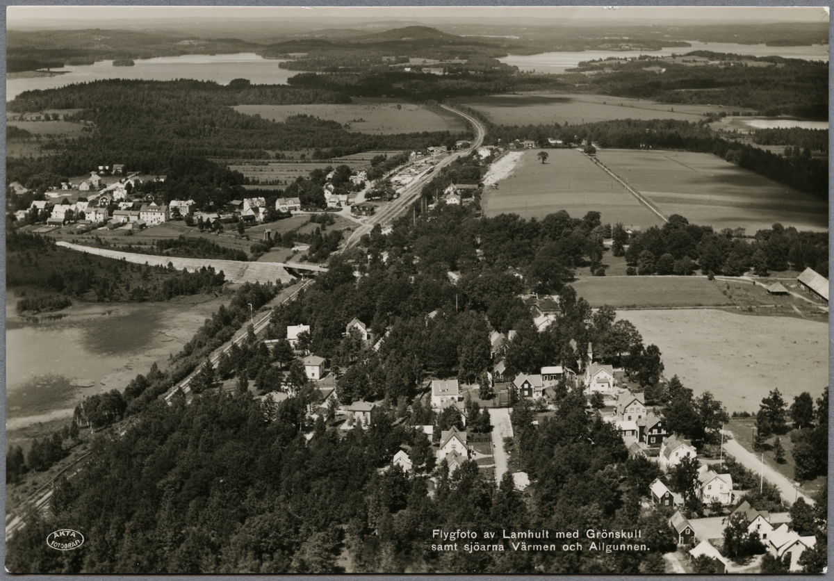 Flygfoto över Lammhult. I bakgrunden berget Grönskulle mellan sjöarna Värmen och Allgunnen.