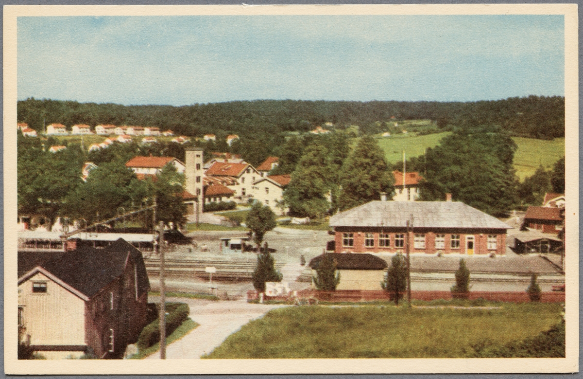 Vy över Lerum med järnvägsstationen och brandstationen.