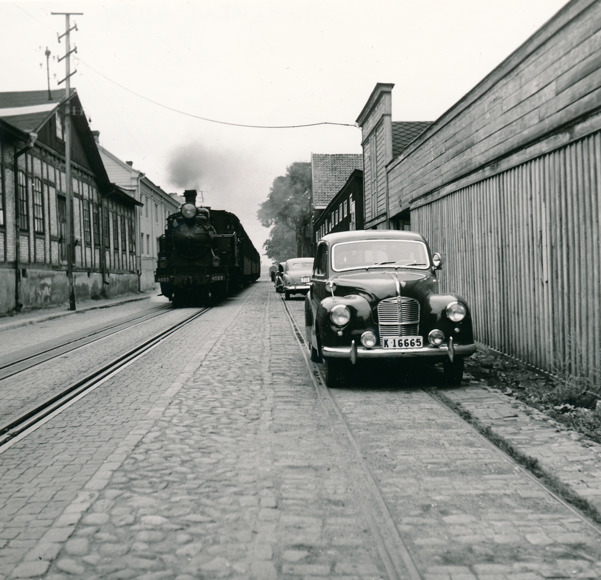 Tåg med ånglok passerar Prinsgatan. SJ S3t 4053.