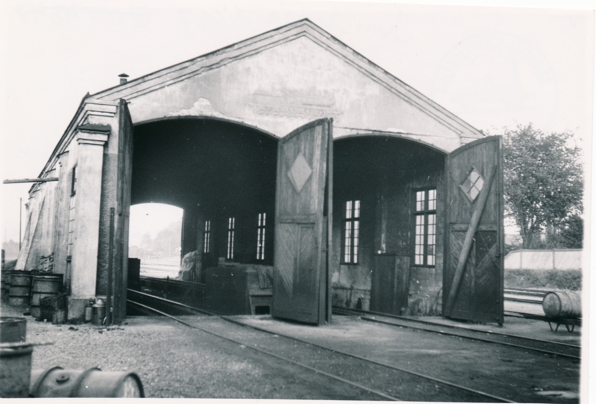 Kristianstad - Hässleholms Järnväg, CHJ Smalspåriga bangården med lokstall Obs! loket ovanför dörrarna.