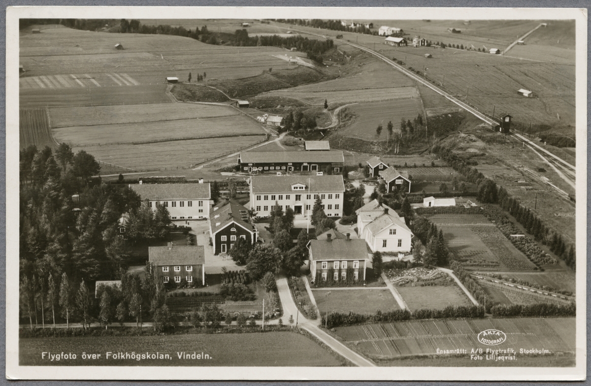 Flygfoto över Vindeln med folkhögskolan i centrum på bilden.