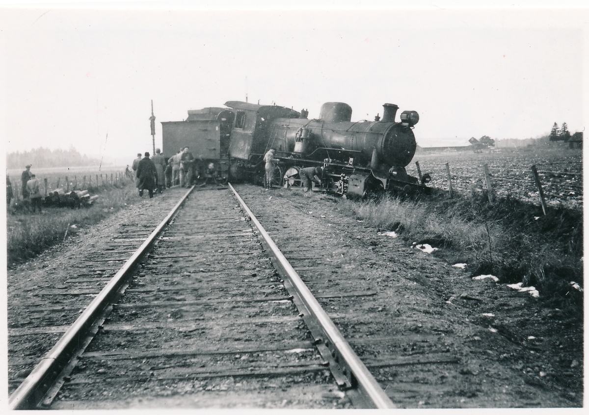 Trafikaktiebolaget Grängesberg - Oxelösunds Järnväg, TGOJ M3 50. Urspårning mellan Valskog och Köping annandag jul 1946.