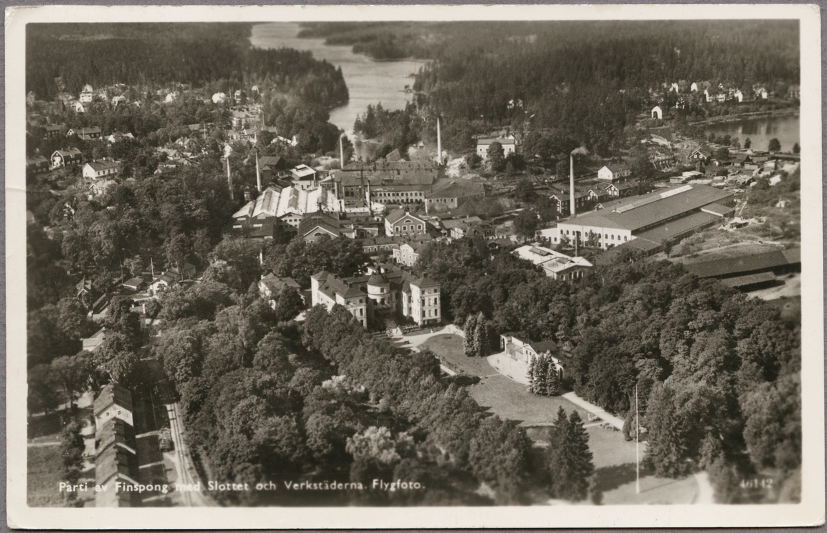 Flygfoto över Finspångs Metallverks AB och slottet.