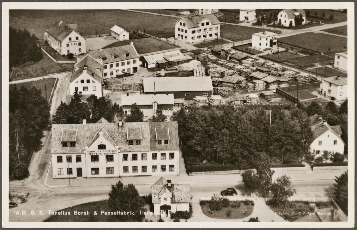 Flygbild över Aktiebolaget G. E. Tunelius borst- & penselfabrik, Tierp
