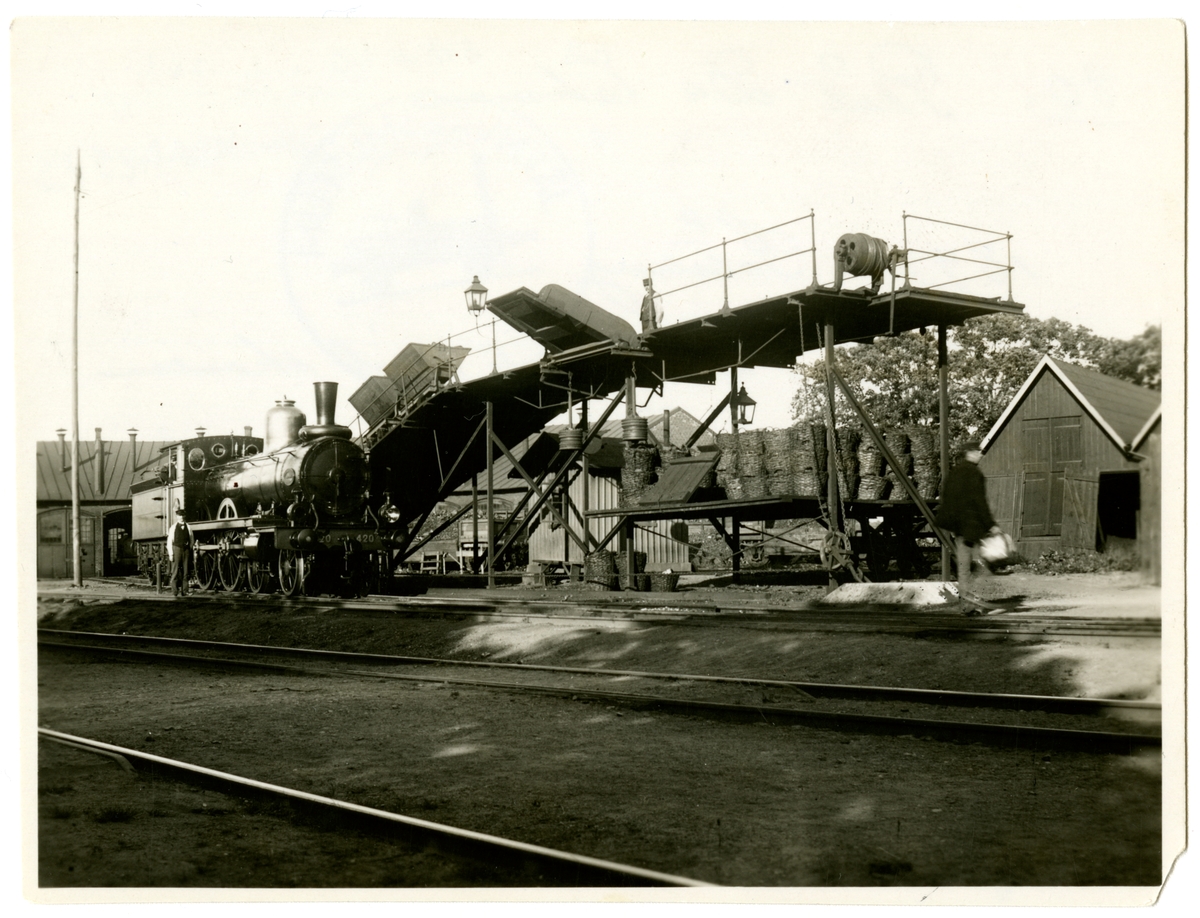 Statens Järnvägar, SJ Cc 420. Gamla lokstallet vid Skansen, "Lejonet". Kolgivningsbryggan. Detta var den första i sitt slag vid SJ, Statens Järnvägar. Konstruerad av dåvarande Maskindirektör Fredrik (Fritz) Wilhelm Henrik Pegelow.