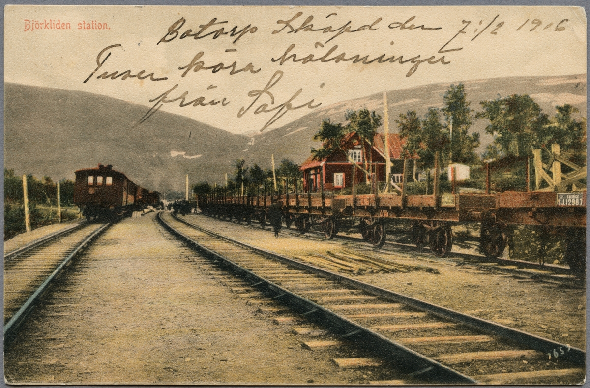 Statens Järnväg, SJ stolpvagn 12987 med flera vagnar i Björkliden.
