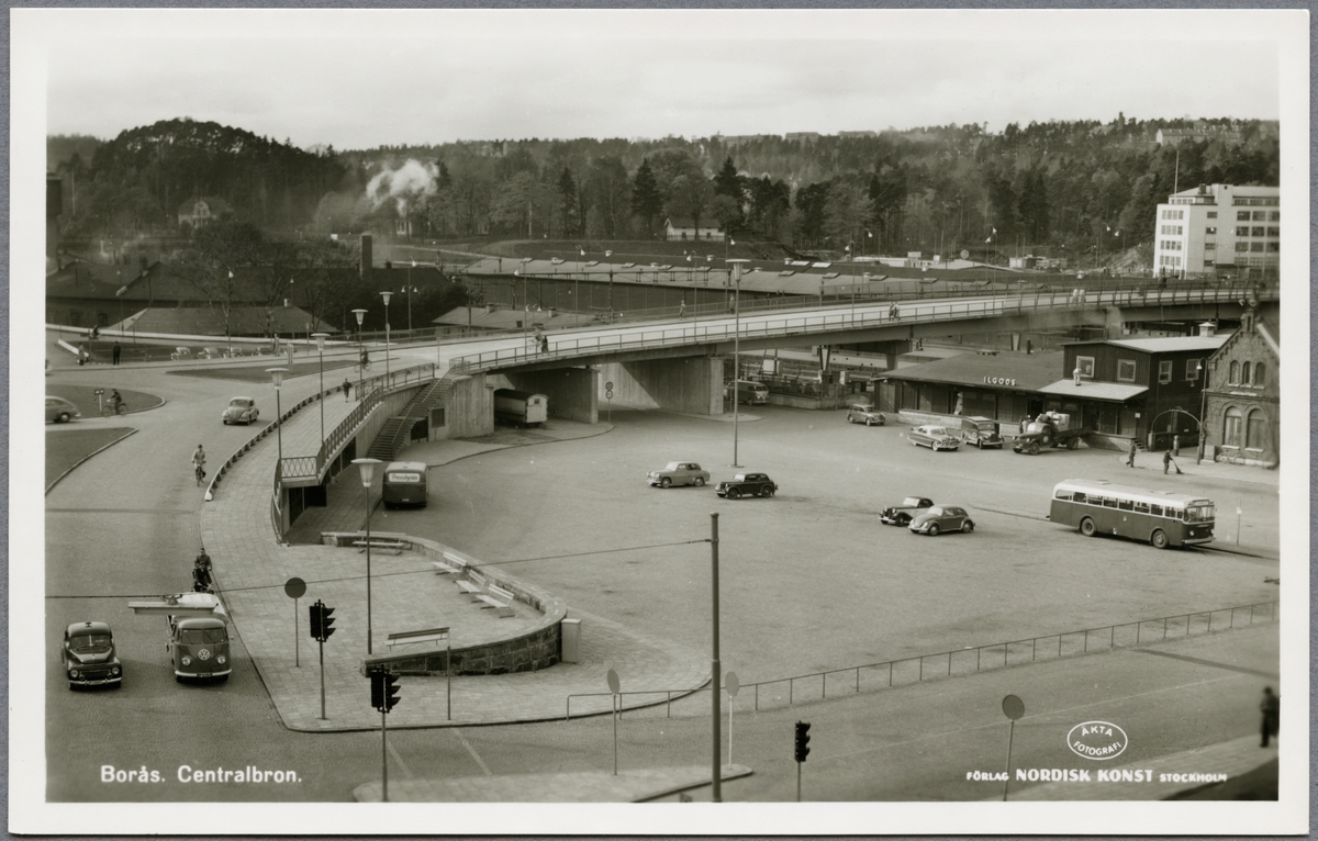 Vy över Centralbron och spårområdet tillhörande Borås centralstation. En del av stationshuset skymtar till vänster om godsmagasinet.