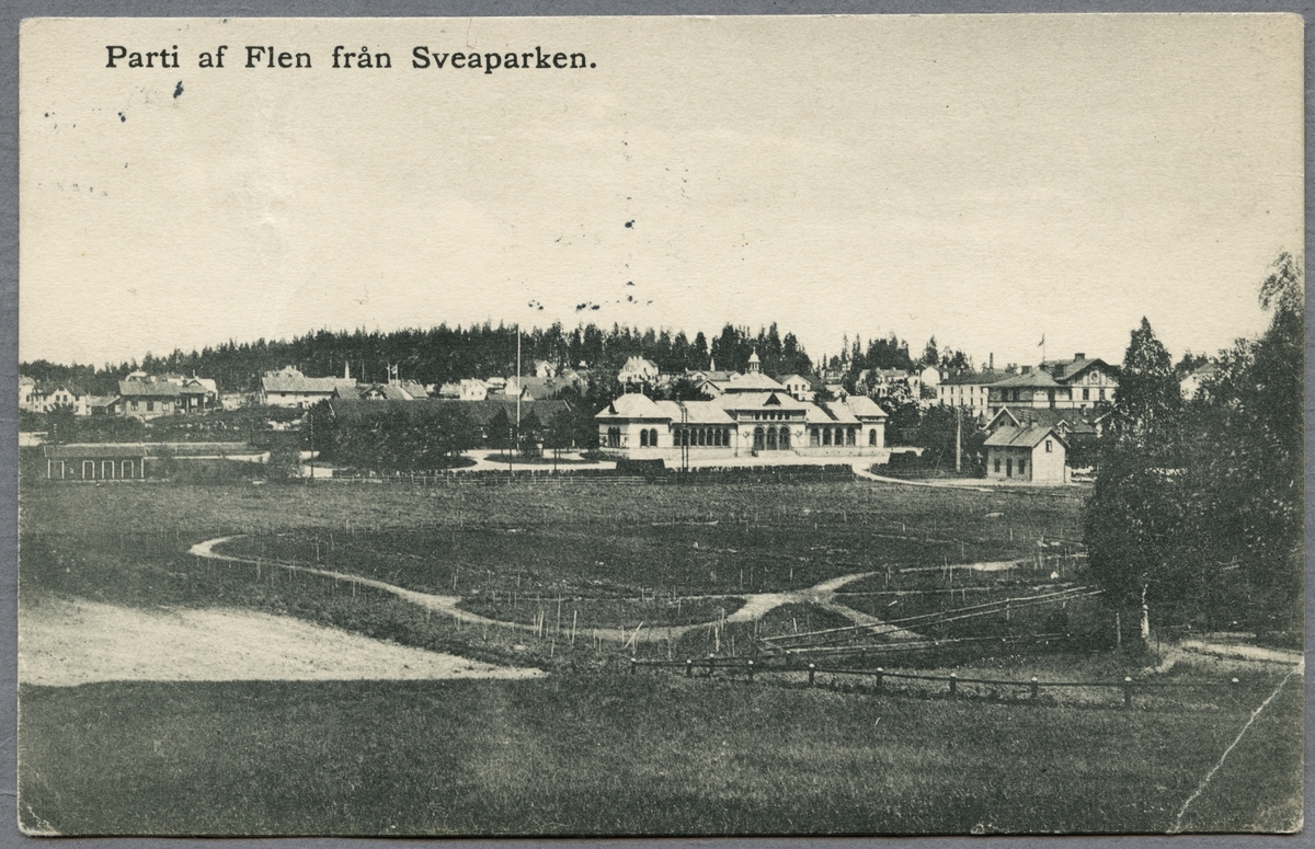 Vy av Flen från Sveaparken. Stationshuset syns mitt i bild.