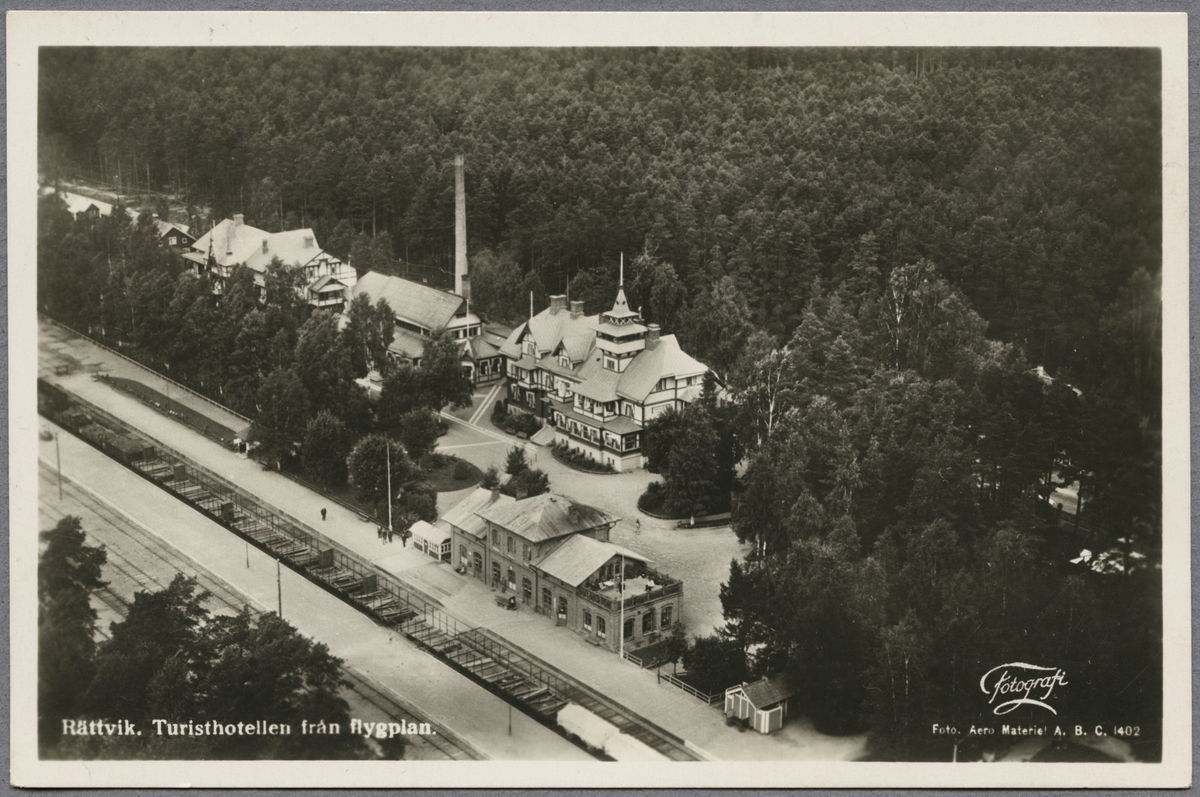 Flygfoto över Rättvik station och hotell.