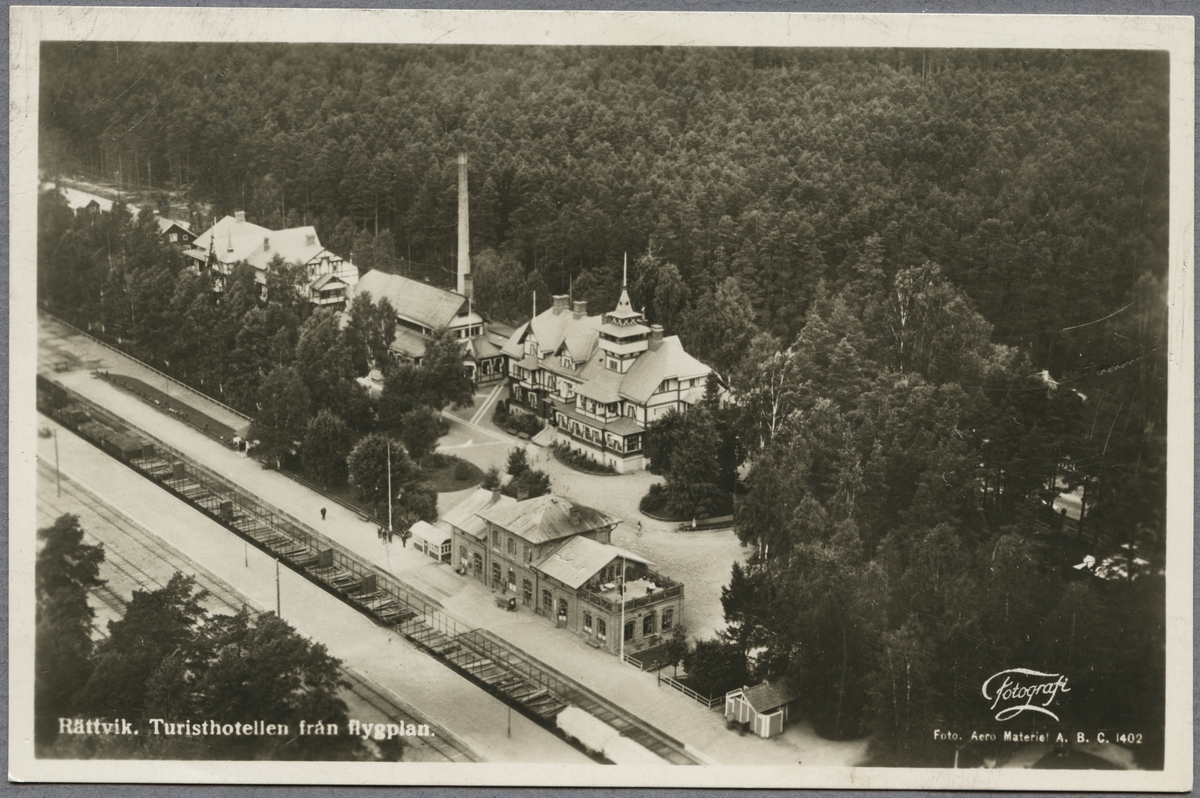 Flygfoto över Rättvik station och hotell.