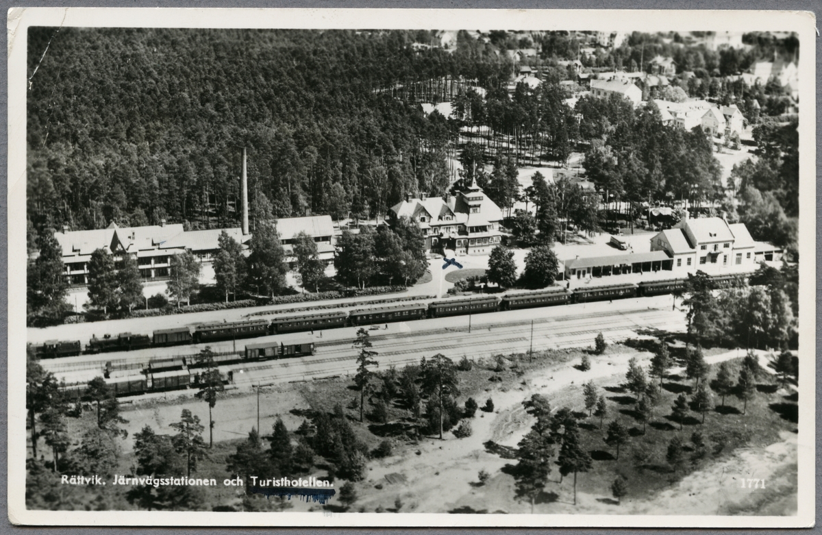 Flygfoto över Rättvik station och hotell.